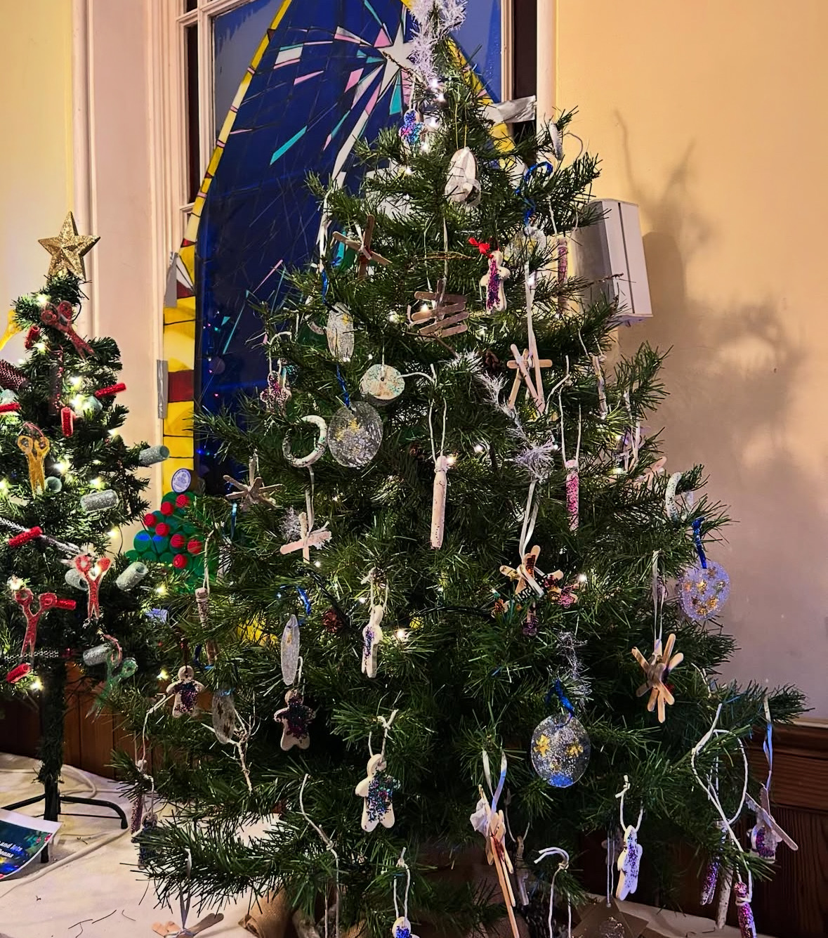 Children have decorated the Christmas Tree on display at St John Burlington  Methodist Church